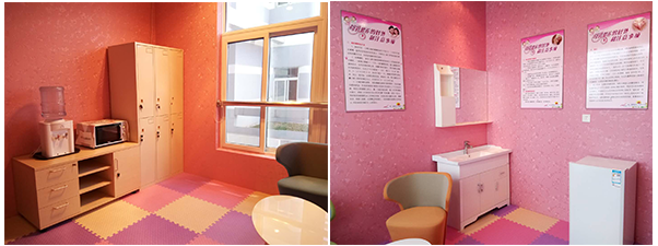 “愛心母嬰室”設置在活動室二樓,面積11平方米,可容納4人同時哺乳。母嬰室內(nèi)設施完善,配備冰箱,飲水機,儲物柜,微波爐,洗手池,宣傳標識牌,軟座沙發(fā)等現(xiàn)代化設施,可以為哺乳媽媽們提供一個干凈衛(wèi)生、溫馨舒適、安全私密的哺乳環(huán)境。