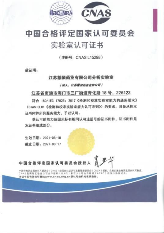 2021年8月18日,江蘇慧聚藥業(yè)有限公司通過審核,取得CNAS認(rèn)證證書。此次獲得CNAS審核,既是對分析實驗室的技術(shù)實力及體系管理實力的認(rèn)可,也是慧聚藥業(yè)建設(shè)國際一流實驗室道路上的關(guān)鍵一步。面向未來,分析實驗室將繼續(xù)秉承“數(shù)據(jù)準(zhǔn)確、運(yùn)轉(zhuǎn)高效、行為公正、態(tài)度嚴(yán)謹(jǐn)”的質(zhì)量方針,嚴(yán)格按照法規(guī)要求、體系要求、國際標(biāo)準(zhǔn)、國內(nèi)標(biāo)準(zhǔn)認(rèn)真控制各檢測環(huán)節(jié),發(fā)揮各職能部門功能,完成各項檢測任務(wù),以專業(yè)的技術(shù)支持,確保檢測報告的準(zhǔn)確及時,持續(xù)提升客戶滿意度。